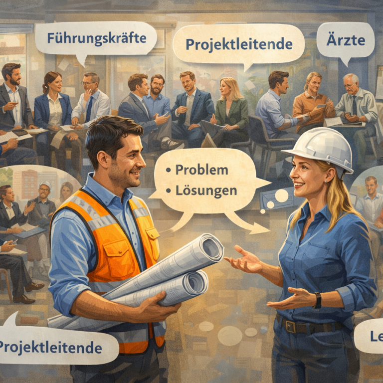 Personengruppen wie Führungskräfte, Projektleitende, Ärzte, Architekten oder Lehrende haben ihre berufsspezifischen Herausforderungen. Die Peer-Circles bringen Personen aus genau diesen spezifischen Personengruppen zusammen. Stellen Sie sich vor, Sie stehen als Bauleiter in Ihrem Unternehmen vor einer Herausforderung und eine Bauleiterin eines anderen Unternehmens hat genau für dieses Problem bereits Lösungen gefunden.