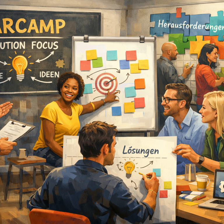 Bar-Camp gepaart mit Solution-Focus-Ansatz. Hier kommen Personen aus unterschiedlichen Unternehmen mit diversen Hintergründen zusammen und arbeiten lösungsorientiert an spezifischen Herausforderungen unter professioneller Moderation.