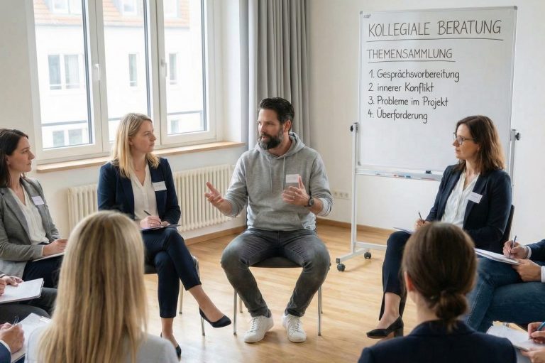 Die Kollegiale Beratung ist eine strukturierte Methode, in der eine feste, vertrauensvolle Gruppe (ca. 6-8 Personen) regelmäßig zusammenkommt, um sich gegenseitig bei beruflichen Herausforderungen zu unterstützen. In einem moderierten Prozess erarbeiten die Teilnehmenden gemeinsam neue Perspektiven und Lösungsansätze.